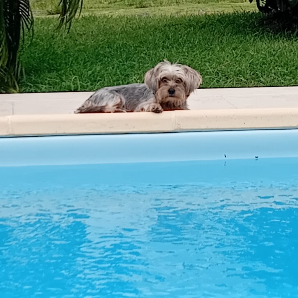 Sur la propriété, notre petit chien Yorkshire affectueux, très sociable se balade.